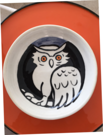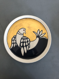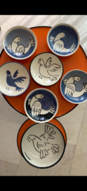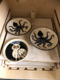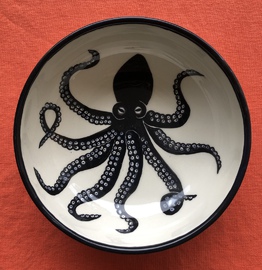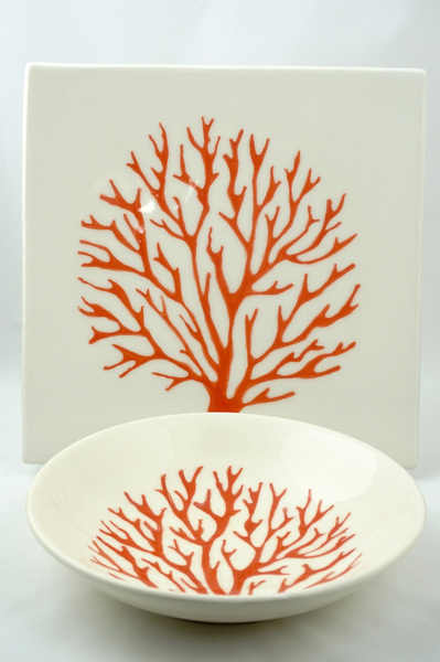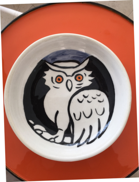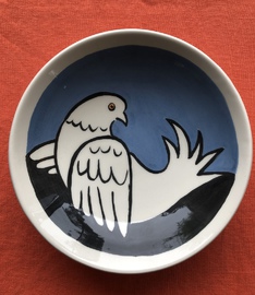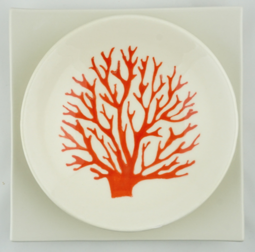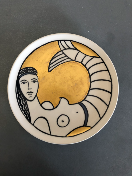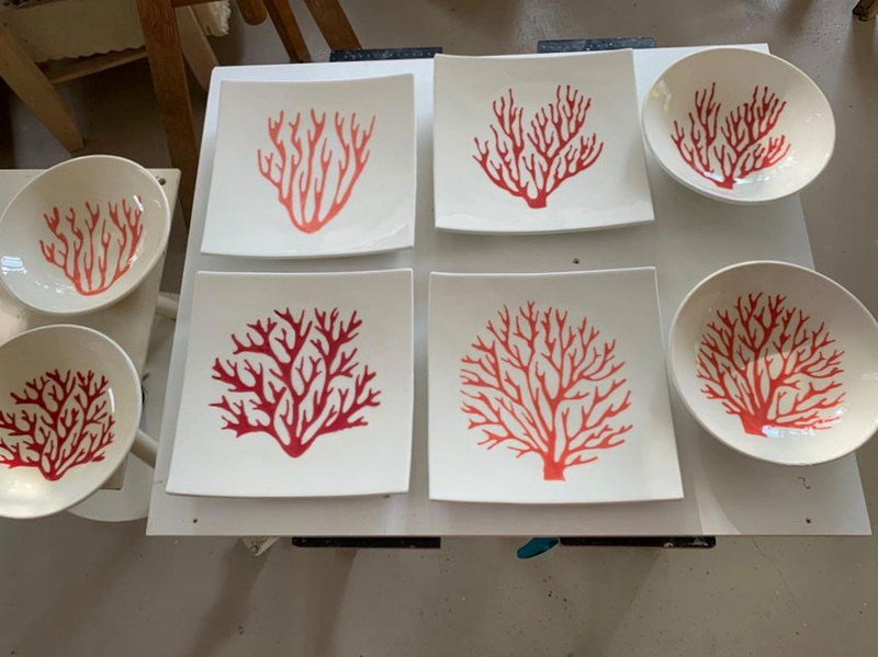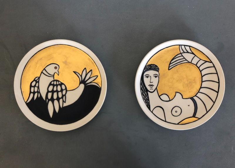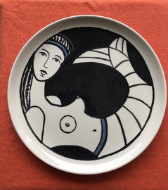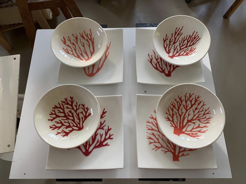 Élégie développe une collection dédiée à la décoration intérieure et à l’art de la table. Décors originaux, peints à l'engobe à main levée sur faïences de Vallauris, puis émaillées, double cuisson. Utilisation alimentaire.